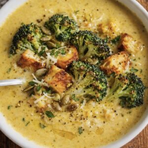 - Melt the butter in a large pot over medium heat. Add the onions and cook until soft, about 5 minutes. Add the garlic and cook until fragrant, about 30 seconds. Add broccoli stalks and cook until bright green and just beginning to soften, about 5 minutes. Stir in the broth, increase the heat to medium-high, and simmer until the stalks are tender, about 5 minutes. Add the florets, cream, and nutmeg and simmer until florets are tender, about 5 minutes. Meanwhile, in a dry skillet on medium heat toast the pepitas for about 2-4 minutes.Puree the soup in batches in a blender, or use an immersion blender to blend the soup right in the pot. Then bring the soup back to a simmer.Slowly add the cheese and melt it into the soup and season with salt and the pinch of cayenne pepper. Serve and garnish with pepitas seeds, croutons, and extra cheese. The soup can be refrigerated for up to 3 days. Reheat over medium heat until hot, but do not boil or the cheese will separate.HAPPY EATING!!
