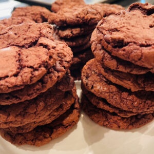 - Pre-heat the oven to 375°In a medium sauce pan over medium-high heat melt the stick of unsalted butter. Once the butter is fully melted take the pan off the heat and add 2 cups of semi-sweet chocolate chips. Stir mixture off the heat until it is smooth and set it aside.Meanwhile, sift together flour, cocoa, baking powder, and salt in a medium bowl. Line two baking sheets with parchment paper. Once the chocolate mixture has cooled add eggs, granulated sugar, brown sugar, and vanilla all to a stand mixture fitted with the paddle attachment. Add the dry mixture to the wet mixture. Add the remaining semi-sweet chocolate chips to the mixture and stir with a spoon. Using a small ice cream scoop, portion out the dough onto the baking sheets. There is no need to space the cookies out. Bake until the edges are set 12 to 14 minutes.Let cool for 4 minutes and transfer to a plate. Store up to 5 days.HAPPY EATING!!