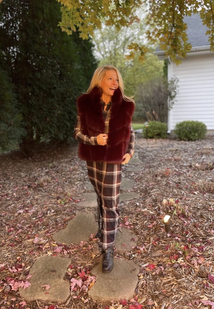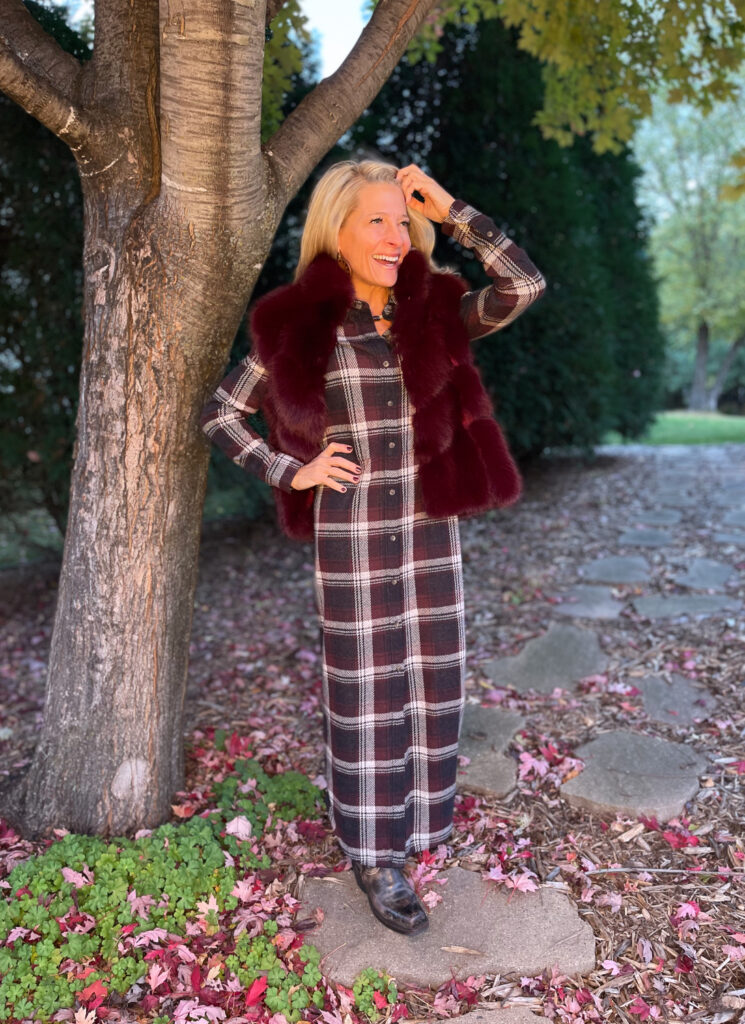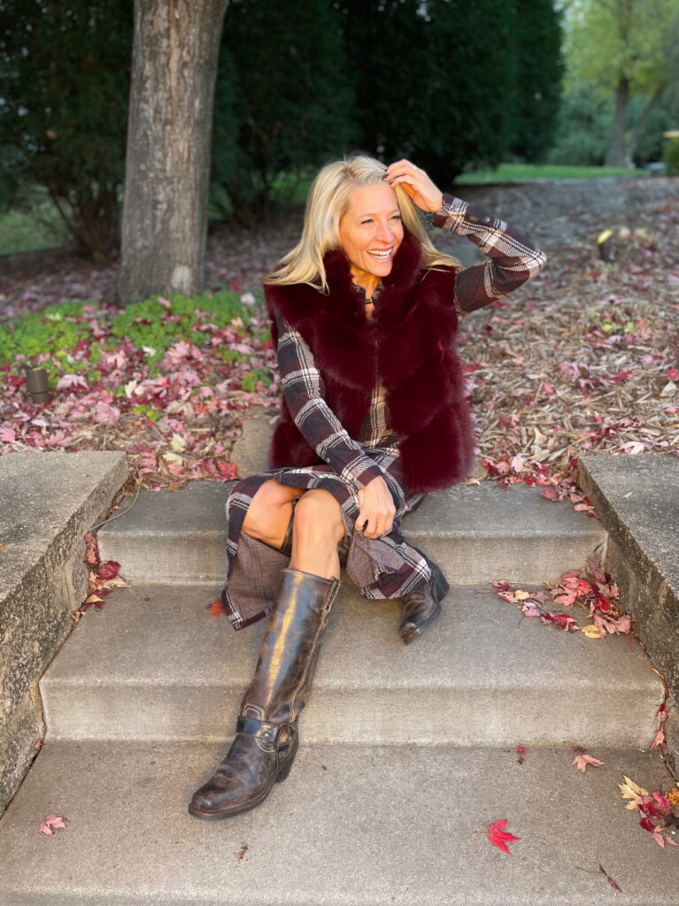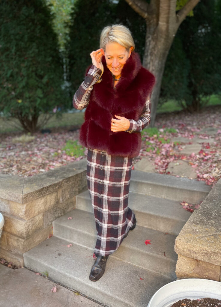 Let one focal point do the talking; here, it’s the burgundy faux fur vest. The plaid in the dress keeps the look grounded and approachable. The Frye Harness boot balances out the softness above. The overall color story stays cohesive, so the look reads as intentional luxury rather than fussy.