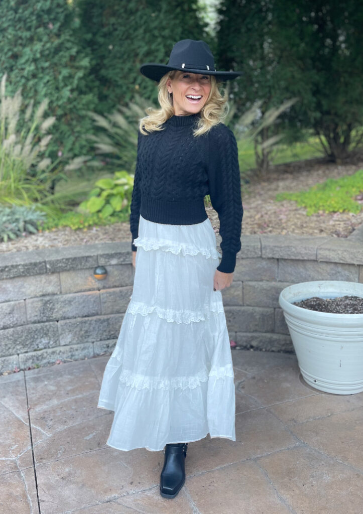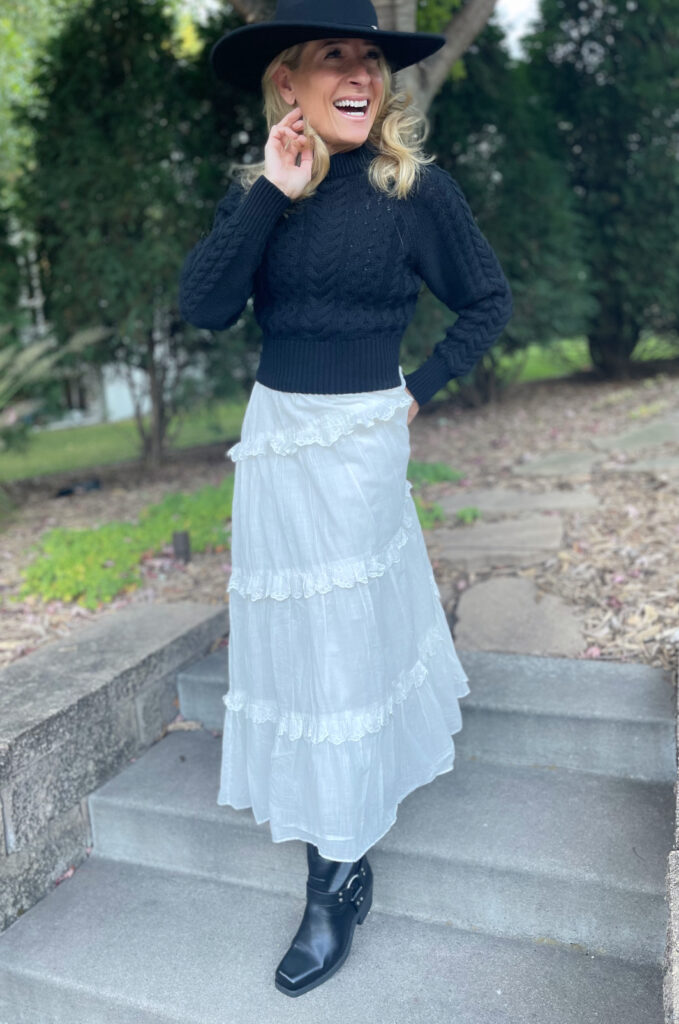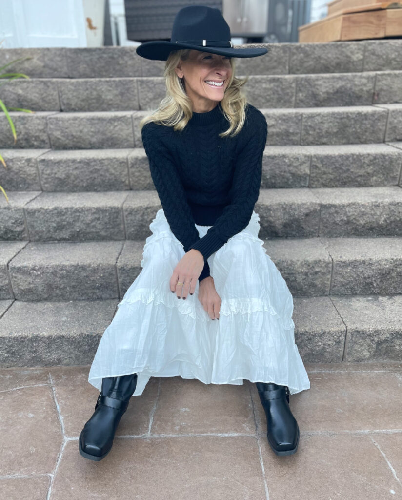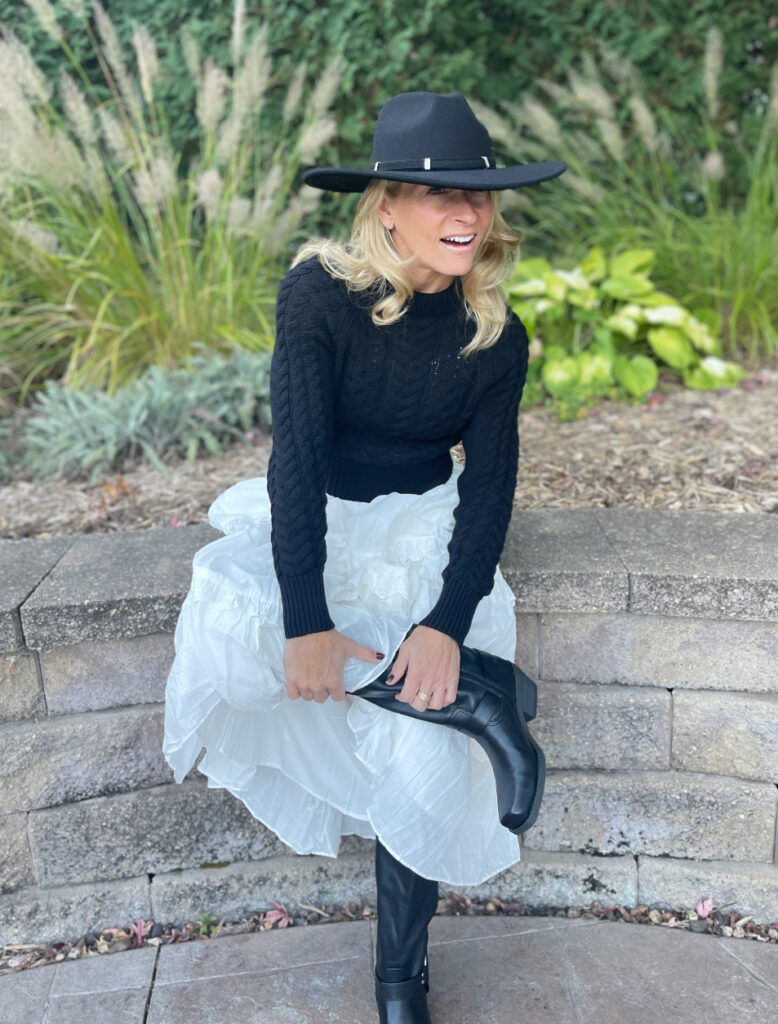 The magic is in the balance of the rugged boots, the feminine dress, the preppy cable knit sweater, and the hint of frontier romance in the cowboy hat. Play around with texture, and color but the simpler the better. Giddy UP!!