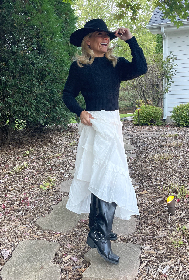 The outlaw cowboy look isn’t about a single item, but about your attitude-and an unapologetic blend of rugged utility and charm. The Twofer dress is my anchor in the outfit. The Target cowboy hat and Harness boots add the edge and accessories to create a very versatile trio.