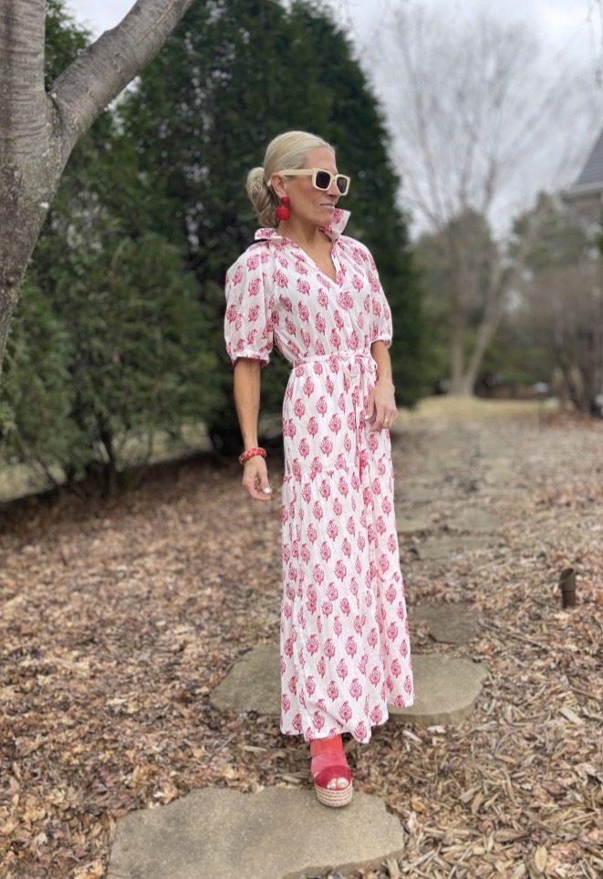 This pink short sleeve maxi dress from Roller Rabbit is light and comfortable and made with cotton-recycled fabric. This dress also is fully lined so it keeps its light flowing integrity without looking cheap and see-through. The pink pattern is uplifting and the small details of tassels at the end of the ties is a darling addition.