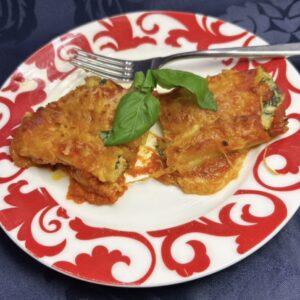 - Preheat oven to 325°. Spray cooking spray on the bottom and sides of a 9 x 13 baking dish.Heat olive oil to large skillet on medium high heat. Add onion. While onion is cooking, chop mushrooms and add to skillet.Add garlic, Italian seasoning, oregano, salt and basil. When onions and mushrooms are well done (about 10 minutes after the mushrooms are added to the pan depending on how small the pieces are cut), add the spinach. Take the skillet off the heat when the spinach is completely cooked and wilted (about 2 minutes).While the vegetables are cooking, cook the manicotti about half of the time that the package directs. Drain and allow to cool.In large mixing bowl, combine ricotta cheese, parmesan cheese, all but 1/3 cup of mozzarella cheese. Pour in the mushroom and spinach mixture. Mix well.Spread a small amount of marinara sauce on the bottom of the baking dish. Gently and using a small spoon, fill the manicotti and place into the prepared baking dish.When all the manicotti are filled and, in the pan, spread the remaining marinara sauce over the manicotti and sprinkle the remaining 1/3 cup mozzarella cheese over the sauce.Bake for 30 – 40 minutes. Manicotti are done when the cheese on top is melted and bubbly.Tips: Cut the vegetables into small pieces to make it easier to fill the manicotti. Large vegetable pieces will lead to tears in the pasta. No worries if the manicotti tears as it will still taste fantastic. Additionally, cook the manicotti about half of the time the manufacturer recommends so the pasta will be a little stiffer and easier to fill. The pasta will continue to cook and soften while baking.HAPPY EATING!!