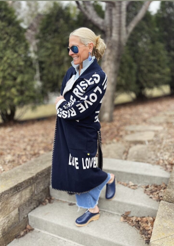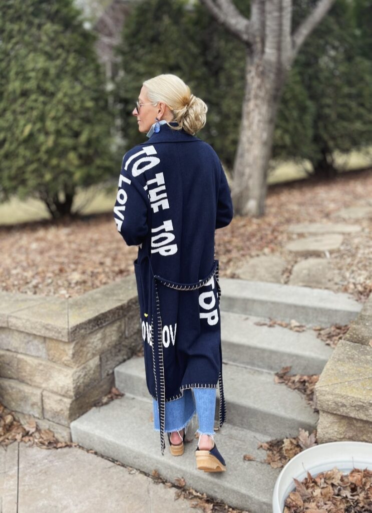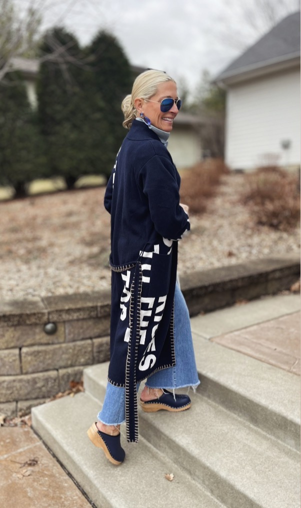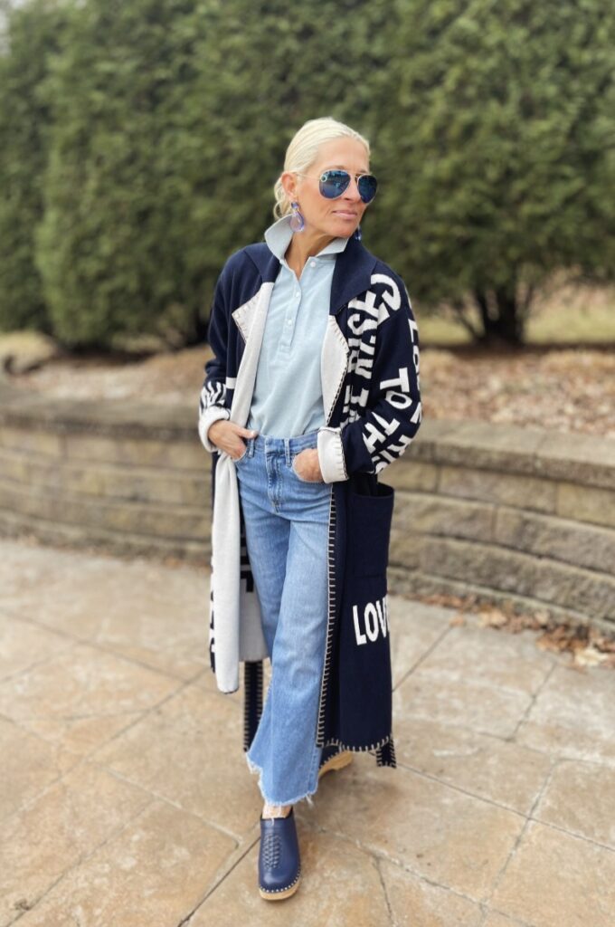 But the frosting on the outfit is my new Kerri Rosenthal navy blue duster sweater. When I say it is comfy that is the understatement of the year. It is like wearing a cozy robe. So yummy.
