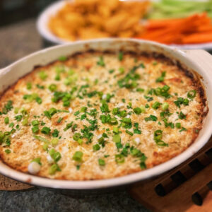 - Preheat oven to 350°In a large mixing bowl, beat the cream cheese with a hand held electric mixer until smooth. Then beat in the mayonnaise until smooth. Add remaining ingredients and stir together until combined. Transfer the dip to a pie plate or shallow gratin dish. Bake in a preheated oven for 30 to 40 minutes until the top is golden brown and the dip is bubbling. Serve hot with crackers, tortilla chips, crostini or veggies.HAPPY EATING!!